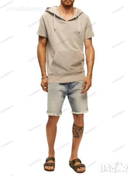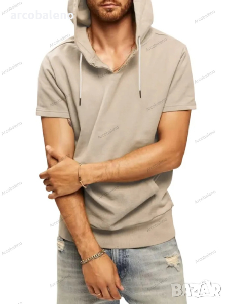 Мъжка ежедневна плетена тениска с качулка и къс ръкав