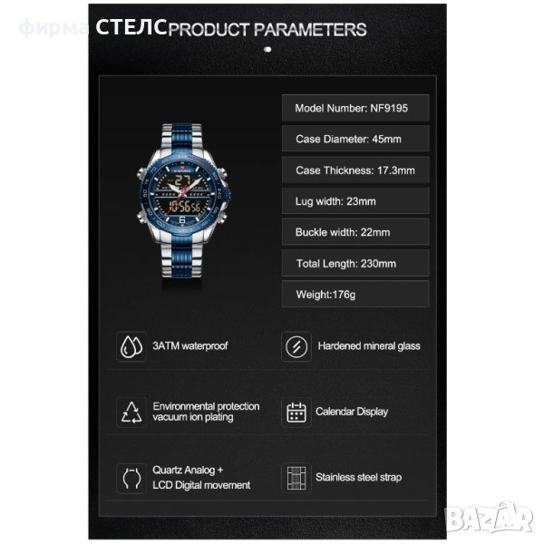 Допълнителни функции - Показва дата, Месец, Ден от седмицата, Показва 24 ч, Хронометър Аларма, Подсветка