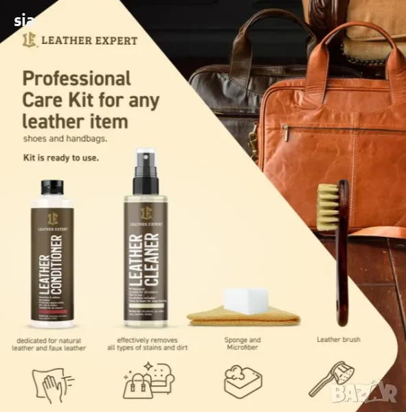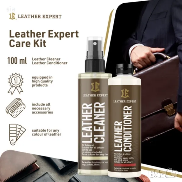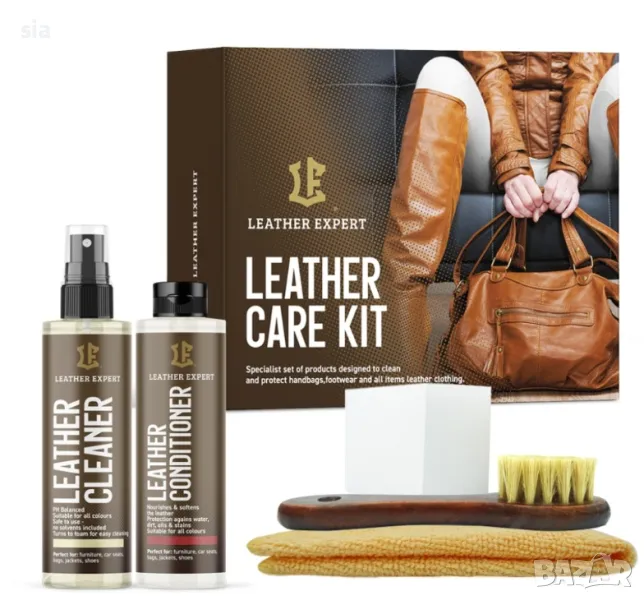 Комплект за почистване на кожа+ балсам за кожа, четка, микрофибърна кърпа, балсам, leather expert