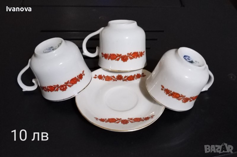 Три порцеланови чашки с чинийки зелена теменужка 10 лв общо