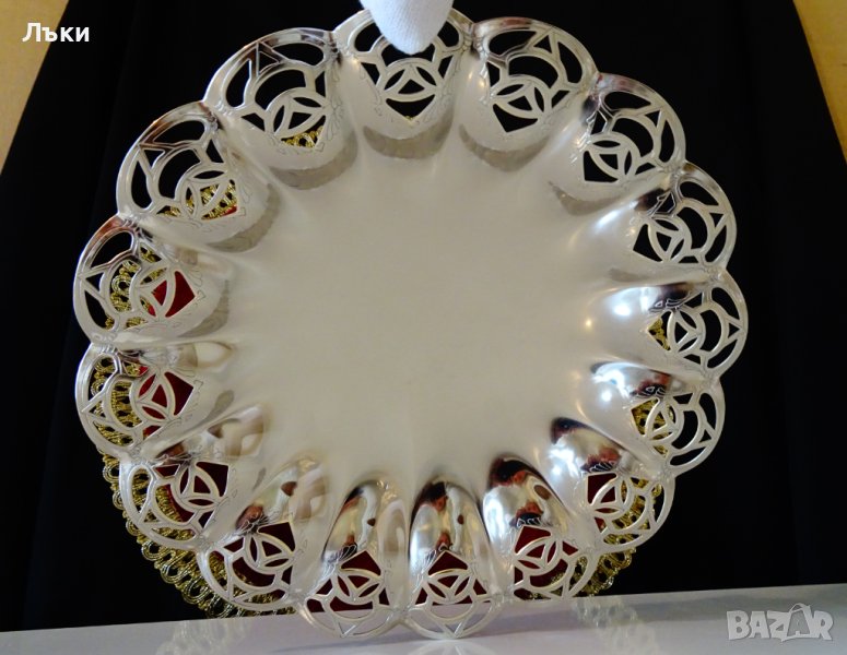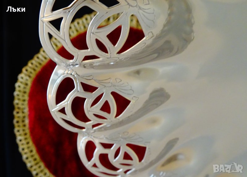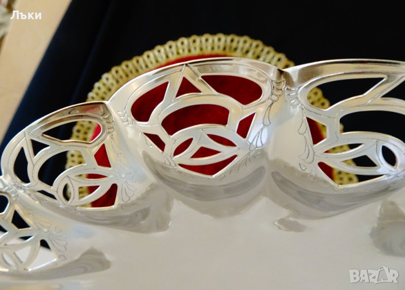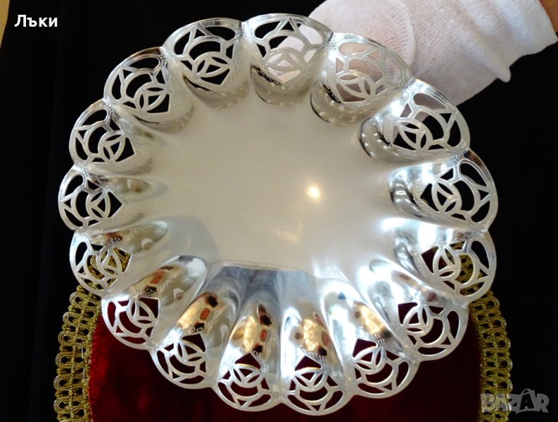 Западно Германска фруктиера,майсторска ръчна изработка на J.Reihhart от бронз.Изключително качествено и дебело посребрена с висока проба сребро,маркирана.Декорирана по края с ажур,релефно гравирани орнаменти и красив