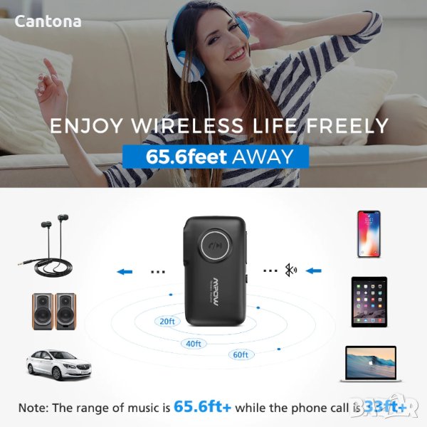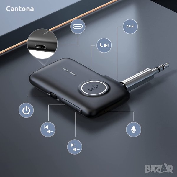 Съвместим с iPhone, iPod, iPad, смартфони с Android, таблети и други електронни устройства с активиран Bluetooth, идеален за всяка задвижвана кола с AUX интерфейс и домашна стерео звукова система и високоговорители чрез 3,5 мм аудио кабел/адаптер.
