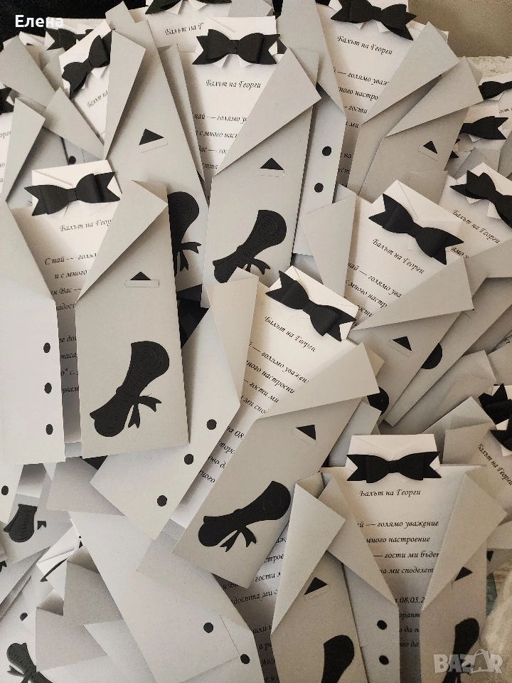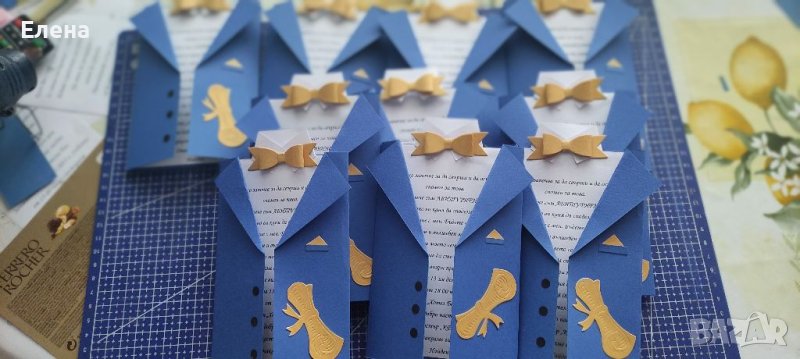 Покани в обявата са на цени от 1 евро изработени изцяло от картон включително папионката.