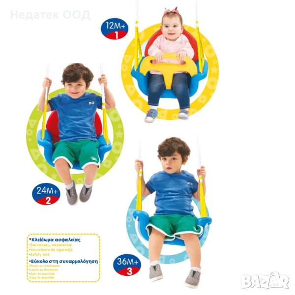 Висяща люлка 3 в 1 за различните етапи от развитието на детето. С използване на гръб и предпазител е подходящо за деца до 12 месеца, с използване на гръб е подходящо за деца от 12-24 месеца и без гръб за деца над 36 месеца. Монтирайте куките според инструкциите на опаковката.