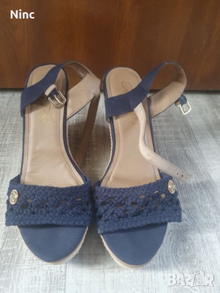 Сандалите са ориг.Стелката е 25 см.Задната част на платформата е 10см.,предната 2см.Насени са 2-3пъти.Нямат забележки.Цвета е т.син.