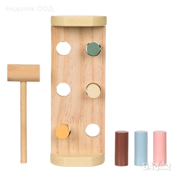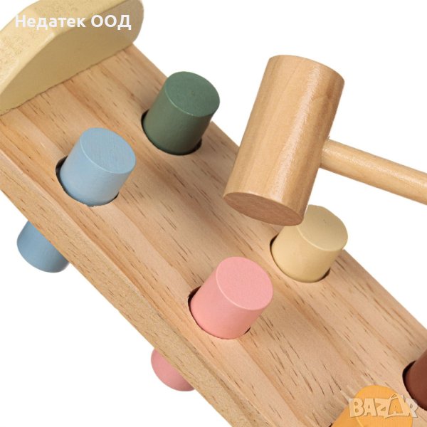 Дървена играчка образователна пейка с дизайн на плюшено мече, 6 цветни ролки - клинове и чукче.