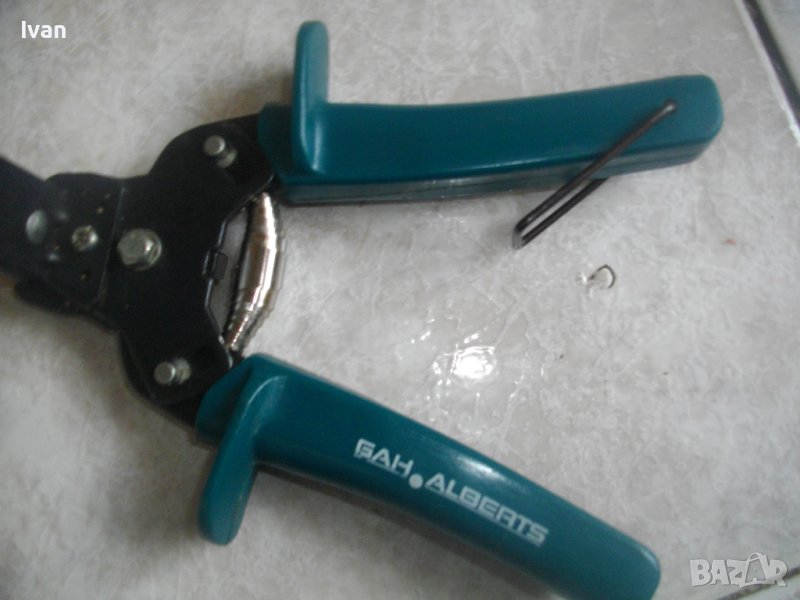 ОПИСАНИЕ на издължените отпред клещи за закрепване н тел на огради-халки - цена на клещите 79,00 лв. НАЛИЧНИ. Немски. ОПИСАНИЕ НА клещи за халки/закрепване на тел. - 79 лв. Почти нови. Немски оригинални професионални. Марка и модел - GAH ALBERTS. Дължина -180 мм, дължина на приспособлението за халки/тел - 185 мм. Отлично техническо/работно състояние. Инокс пружина, поцинковани, заключване на дръжките. Пластмасови масивни вложки на дръжките. Материал - инструментална закалена стомана. Клещите са без халки/тел към тях. Халките се продават в кутии на блистери подобно консумативите за такери.