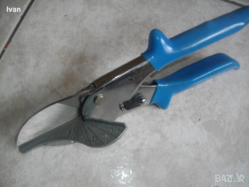 ОПИСАНИЕ на ножица за променливо рязане на пластмаси, тръби, ПВЦ, лайсни, первази под ъгъл 45-120 градуса /светло сини дръжки/ - нова - цена 79,00 лв. НАЛИЧНА. Съвсем нова, неизползвана и неупотребявана масивна, професионална ножица за рязане под ъгъл с променливо водене точно и прецизно в диапазон 45 - 120 градуса на пласмаса, тръби, лайсни, превази.