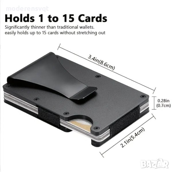 Изработена от съвременни материали, лека и много тънка, може да поддържа до 12 карти и 15 банкноти. Супер тънък и лек профил. Форматът също така позволява съхранение на шофьорска книжка или други карти със стандартен размер 85 х 53 мм.