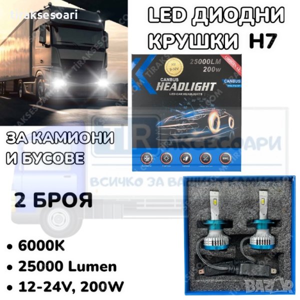LED Диодни крушки за камиони, бусове H7 200W 12-24V +200%