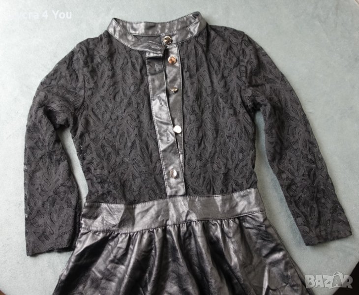 Като нова, черна дантелена рокля с дължина до коляното (или малко над него, зависи от височината), с кожа от талията надолу и дантела в горната половина. С дълъг ръкав.