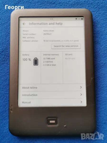 Продавам Tolino shine, това е Kobo за Немския пазар. Има пукнатини на пластмасата, снимал съм ги. Всичко работи както трябва без забележки.