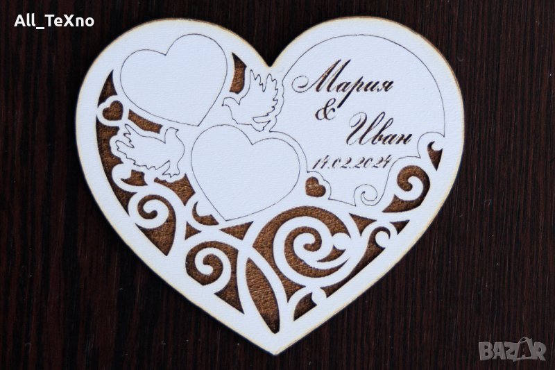 Сватбени подаръци за гости от дърво, лазерно гравирани с имената на младоженците и датата на сватбеното тържество.