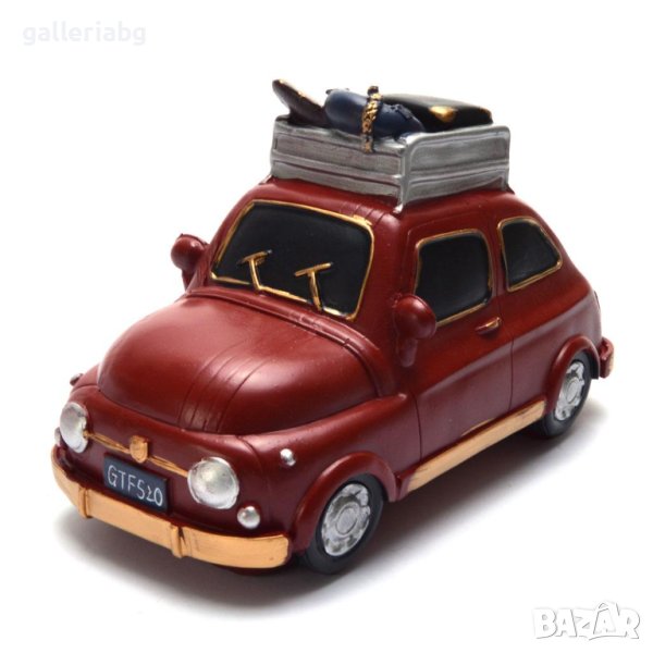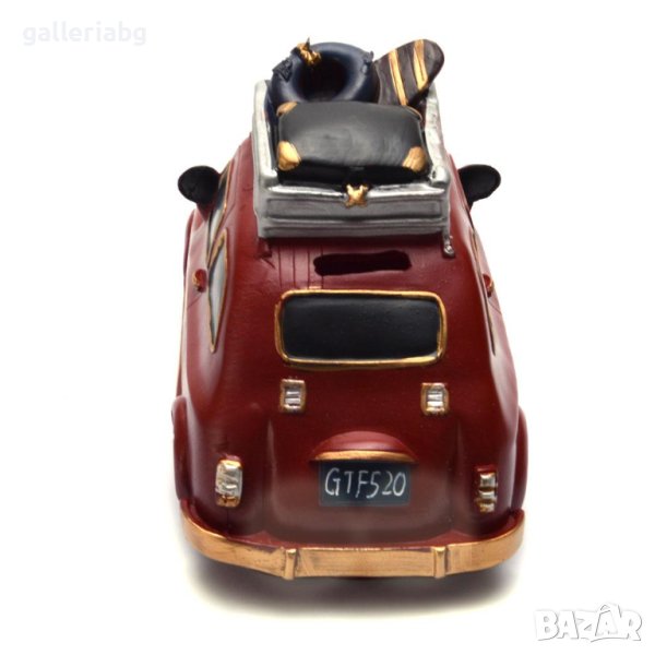 Декоративна касичка във формата на ретро автомобил – кола с куфар и багаж отгоре, изработена от полирезин. Стои супер на рафт, бюро или ракла и едновременно е ефектен декор и практична касичка за спестяване. Подходяща е както за деца, така и за възрастни фенове на ретро автомобили.