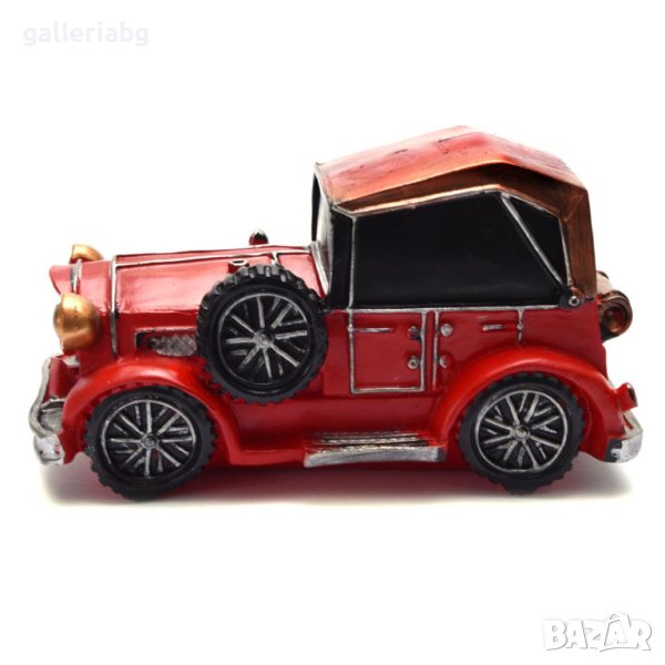Стилна ретро касичка във формата на автомобил, изработена от полирезин. Декоративен модел с много детайли – фарове, гуми, багаж отгоре – стои красиво на рафт, бюро или етажерка и веднага хваща окото.