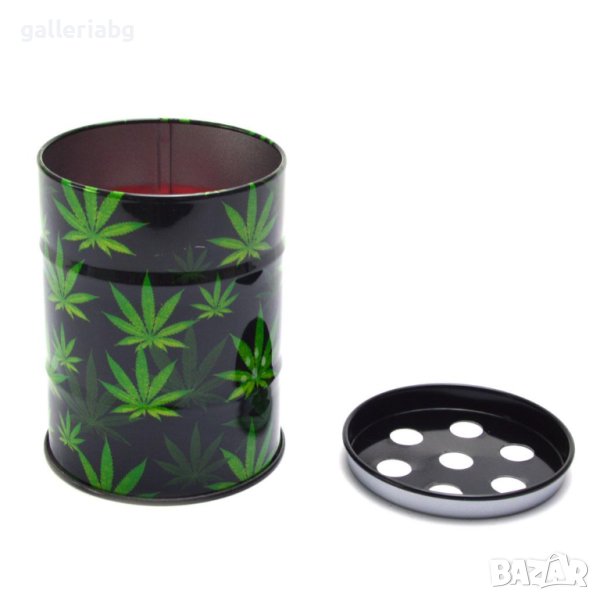 Пепелник с принт на марихуана, изработен от метал. Пепелникът е под формата на варел с отвори при капака.