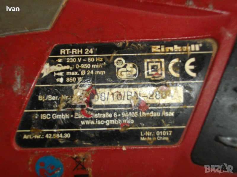 3 позиционен къртач-перфоратор,модел на Ейнхел.Немска марка и лиценз, производство-Китай. Марка и модел-Einhell RT-RH24.С машината е работено,има забележки по външният вид,но е в отлично техническо състояние.Работи много добре.3 функции-пробиване,къртене с удар и само удар.Мощност на мотора-850 вата.Обороти-0-950 в минута.Патронник-SDS.до 24мм.Производство на машината 2008 година.Регулатор обороти на спусъка.Плавен старт на шпиндела,реверс смяна посока.Автостоп-бутона е хлътнал надолу и не функционира,но това не пречи на работата на машината.Масивна здрава редукторна кутия от хромирана стомана.Корпус-твърда бакелитова пластмаса.