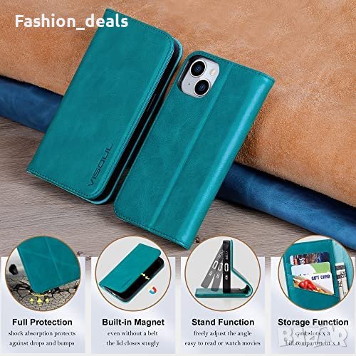 VISOUL Wallet Case е многофункционален калъф от естествена кожа, който предлага защита и удобство. С 3 държача за кредитни карти и малък джоб за пари в брой, този калъф разполага и с магнитно затваряне, стойка за гледане без ръце, прецизни изрези и бутони и вътрешна обвивка от TPU за защита от удари. Калъфът се предлага в красива опаковка и е наличен в ментово син цвят.