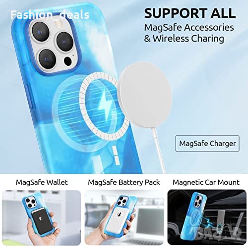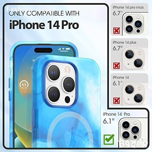 Калъфът за iPhone 14 Pro е проектиран така, че да осигурява 360-градусова защита на цялото тяло с калъф за телефон, протектор на екрана и протектор на обектива на камерата в една инвестиция. Калъфът е оборудван с 38 вградени магнита за по-силна магнитна адсорбция и е съвместим със зарядно устройство MagSafe, портфейл, комплект батерии, стойка за кола, пръстен и други аксесоари. Калъфът е изработен от първокласен гъвкав материал TPU с меко покритие на допир и се предлага в ярки цветове, като добавя нотка на изкуство към телефона ви, докато го предпазва от драскотини, пръстови отпечатъци и пожълтяване. Повдигнатите ръбове предпазват екрана и камерата, а за допълнителна защита са включени протектор за екран от закалено стъкло и протектор за обектива на камерата. Калъфът също така предлага удобен захват и има 0,8 мм ръб на екрана и 0,5 мм рамка на камерата.