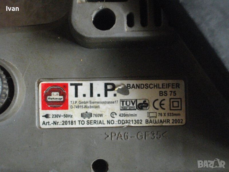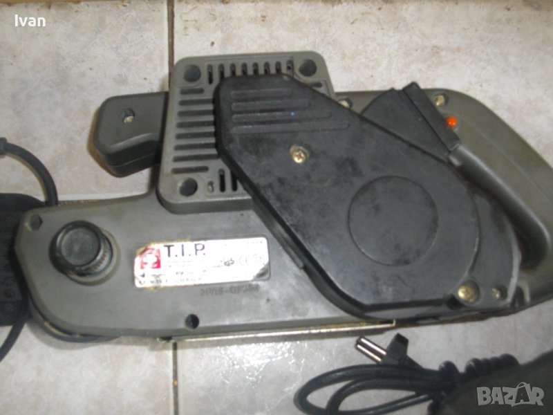Описание на машина 760 вата немска сива марка Т.И.П. без торба- Машината е със забележка-работи много силно,мощно,бързо,вдига веднага максимални обороти,но има силно искрене на ниво четки или ротор,без да замирисва на изгоряло,дори и при продължително въртене.Цената на машината е съобразена със забележката по техническото състояние.Лентов шлайф.Производство - Германия. Машината е със запазен външен вид и техническо състояние-описано,по-горе.Работи силно,мощно,бързо,върти на сухо..Мощност-760 вата,лентов път скорост-420 метра в минута.За шкурки 76х533мм.Автостоп на спусъка.Дълъг конектор на отпадъчният прах.Четки-външни.Точна марка и модел-TIP BS75.