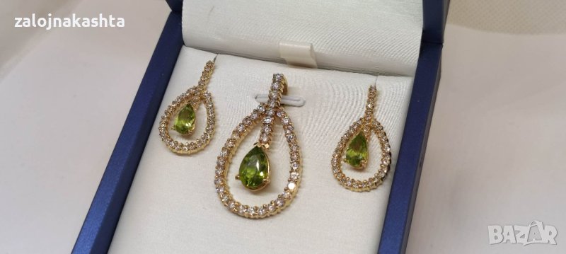 Комплект Златни Обеци и висулка с естествен Перидот и Брилянти-12,71гр/14