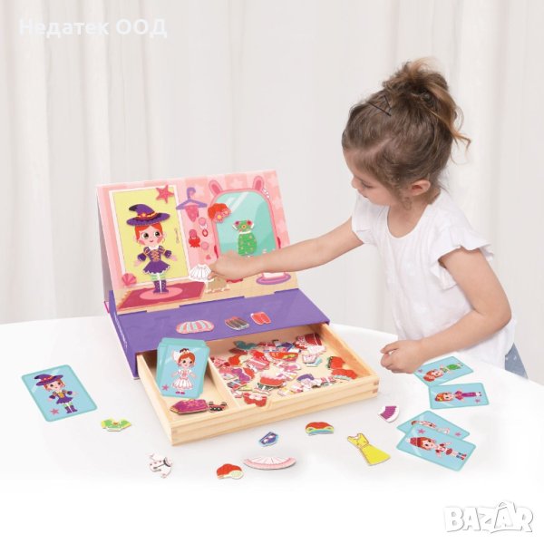 Дървена книга с магнитни дрехи, за да облечете Нина в различни комбинации, дори можете да я трансформирате в принцеса. Комбинирайте парчетата, за да създадете цветни и уникални тоалети. Пакетът включва 1 преносима кутия за съхранение с изтриваема дъска и специална писалка, магнитни импулсни части и карти. Играчката може да се използва като магнитна дъска, плот и кутия за съхранение. Той насърчава ученето на децата и ги насърчава да създават своя собствена история, като развива въображението и координацията на сетивата за докосване и зрение. Изработен е от висококачествени материали.