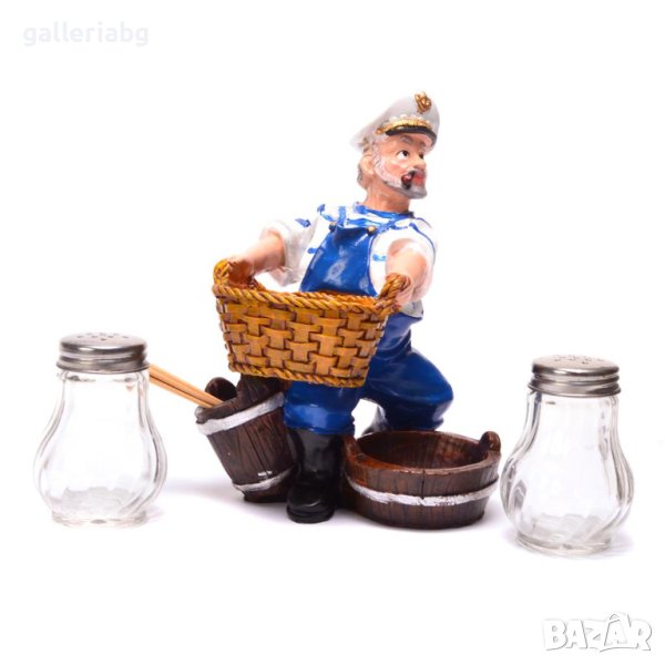 Комплект 2 броя стъклени солници върху поставка - капитан с кошница, изработена от полирезин.