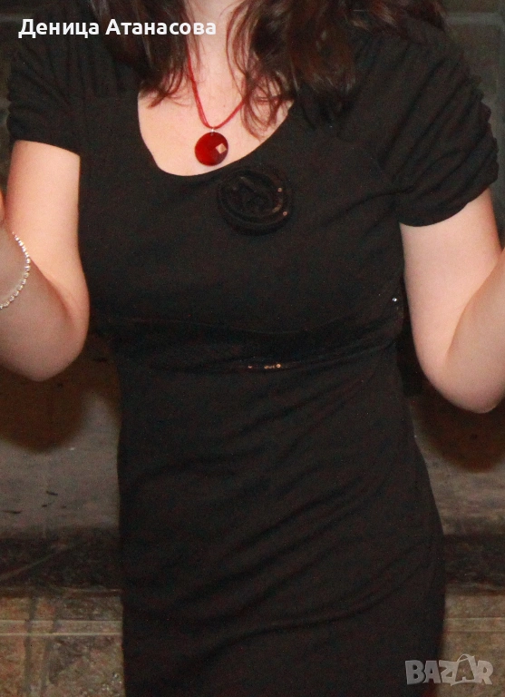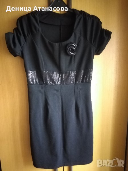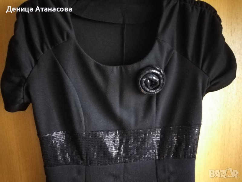 1) Черна рокля с къс ръкав, с висок колан и розичка от лъскави пайети, дължина 85 см - 12 лв.