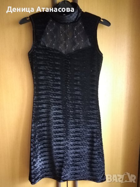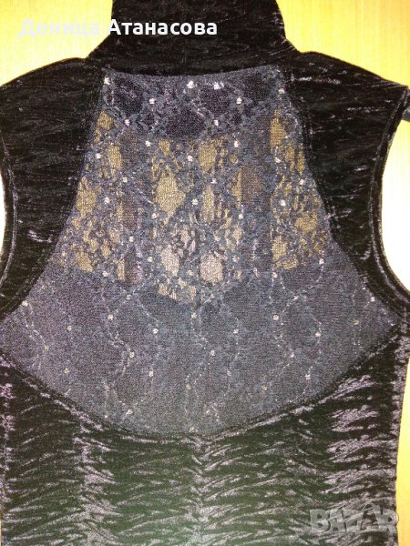3) Плюшена черна рокля без ръкав с якичка тип поло, отпред и на гърба има черна дантела със златни нишки, дължина 84 см - 12 лв.
