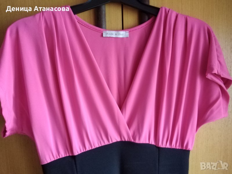 2) Черна рокля с розова горна част от разтеглива материя, с остро деколте, дължина 82 см - 12 лв.