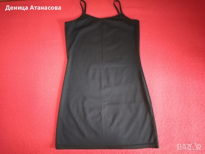 4) Къса семпла черна рокля с презрамки от тънка изкуствена материя, може да се носи и отдолу под прозрачна горна дреха - 5 лв.