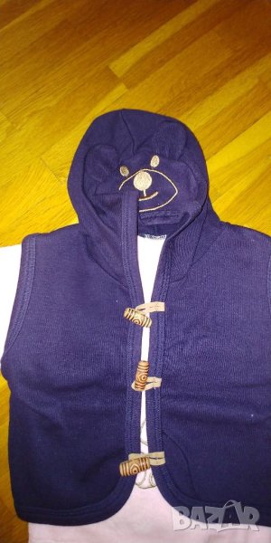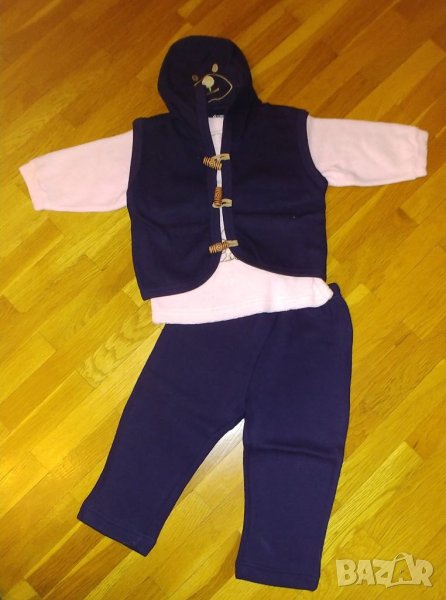 1. Нов комплект розова блузка, тъмно синьо елече с качулка и панталонче.