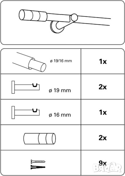 пълен комплект, състоящ се от разтегателен корниз (диаметър 16/19 мм), 3