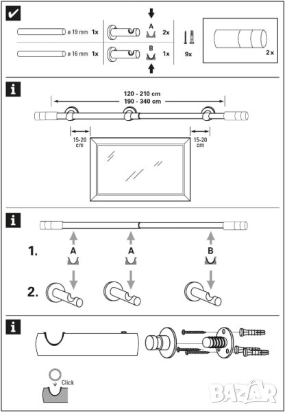 ако е необходимо - Обхват на доставката: 1 комплект корнизи GARDINIA Crete Cylinder, вкл.закрепващ материал, дължина 120-210 см, метал, бял