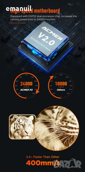 Линейни оси - лагери и по X и по Y позволяващи най-високата скорост на качествено гравиране и при скорост 24000мм/минута или 400мм/секунда.