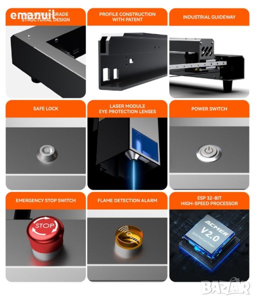 Контролери които могат управляват до 50W лазерен модул,автоматично управление на компресор Air assist през LightBurn,могат да управляват CNC рутер - Лазерна машина със смяна на Firmware,могат да работят с драйвери които се монтират на контролера или с външни драйвери за по-мощни стъпкови мотори NEMA. Контролерите могат да управляват почти всяка марка лазерна машина освен предлаганите от мен :