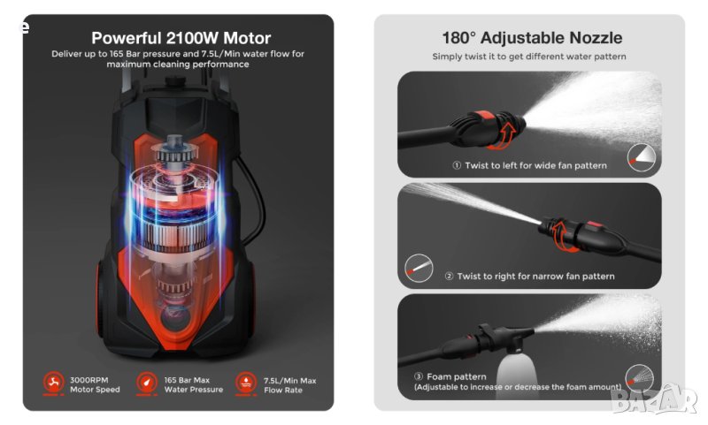Предлага налягане до 165 бара и воден поток от 7,5 l/min за максимална ефективност на почистване.