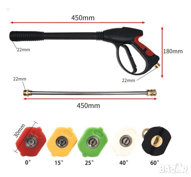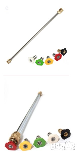 Пистолет със удължителя има 1/4" бърза връзка за опростена смяна на накрайниците за пръскане. Осигурява ви дълъг обсег за изпълнение на различни задачи. Предлага се с комплект 5 накрайника (дюзи) с различен ъгъл на пръскане, различният ъгъл на пръскане ви позволява да почиствате труднодостъпните места бързо и лесно.