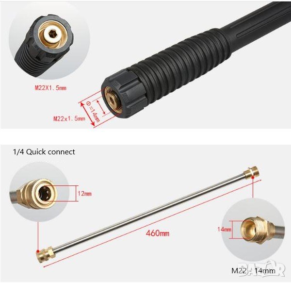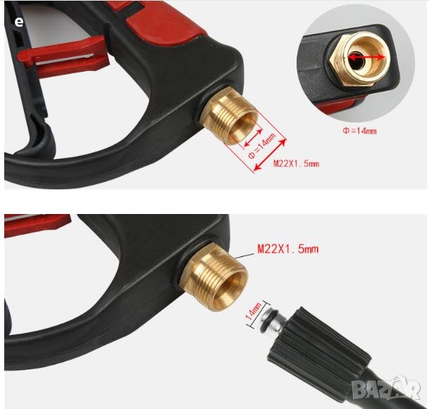 Пистолетът за водоструйки е с резба M22-14mm вътрешен отвор. Връзката на маркуча към пистолета е на резба М22 с вътрешен отвор 14мм ,предлагам допълнително и преходници за които маркучите на водоструйките са на бърза връзка.
