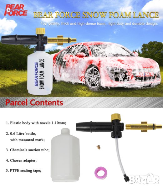 Пянообразувателя е оригинален на BEARFORCE - много икономичен с ниска консумация на препарат прави гъста снежна пяна.Спестяващ разходи дизайн, бутилка от 600 ml, достатъчна за измиване на 1 кола.Този модел е специално проектиран да включва всички характеристики на версията с месингово тяло, на по-ниска цена.