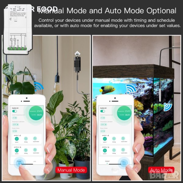 WiFi Интелигентен модул за контролиране на температурата и влажността. Сензорът е комбиниран за да измерва едновременно влажност и температура, там където е поставен. Два управляващи релейни изхода с номинален ток 15А (един за управление на влажност и един за температура) Модулът може да се настройва и наблюдава дистанционно, чрез приложение Smart Life или с гласови асистенти Amazon Alexa и Google Home.