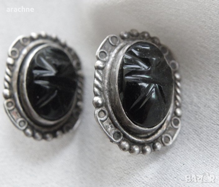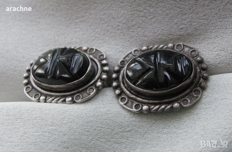 Антикварни сребърни мексикански обици с инталии от обсидиан → Обява 40311343