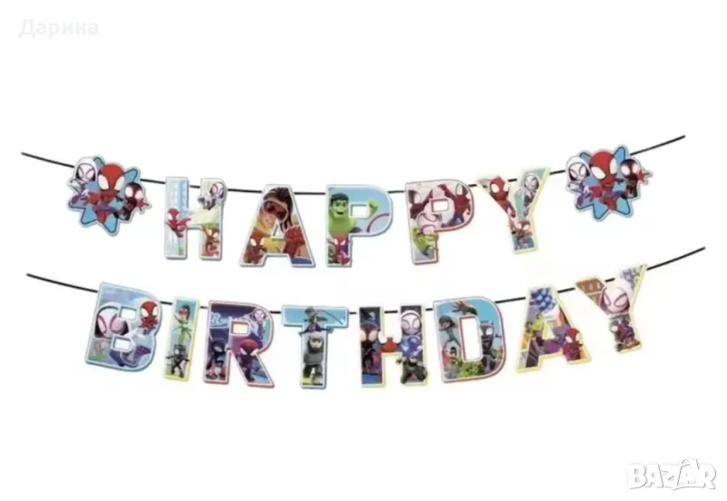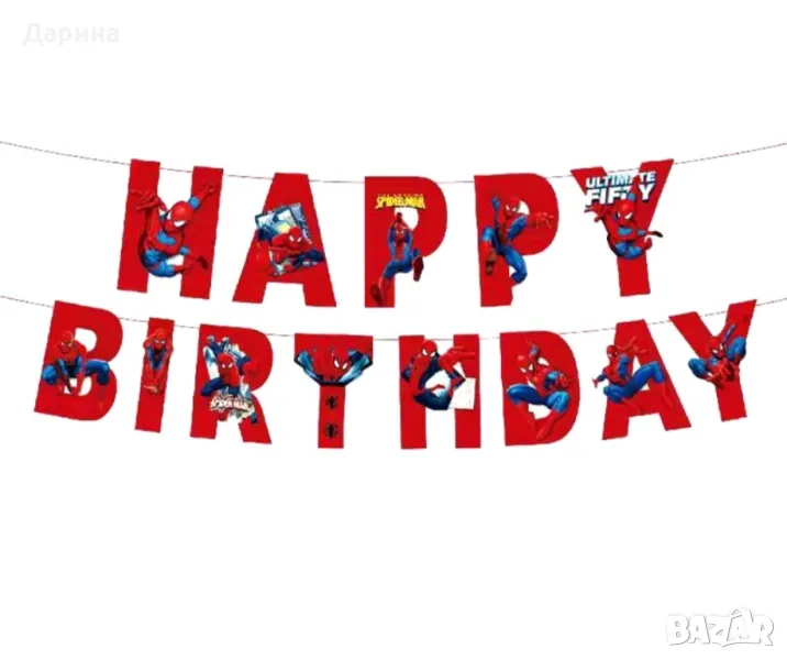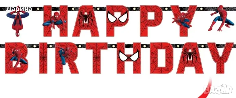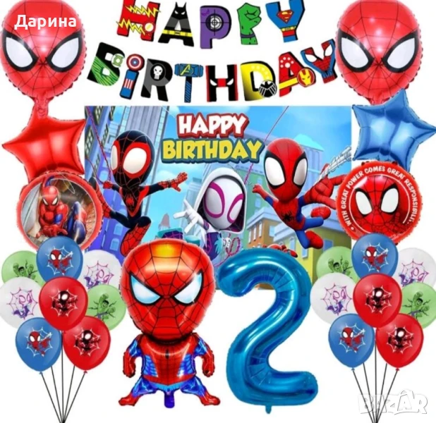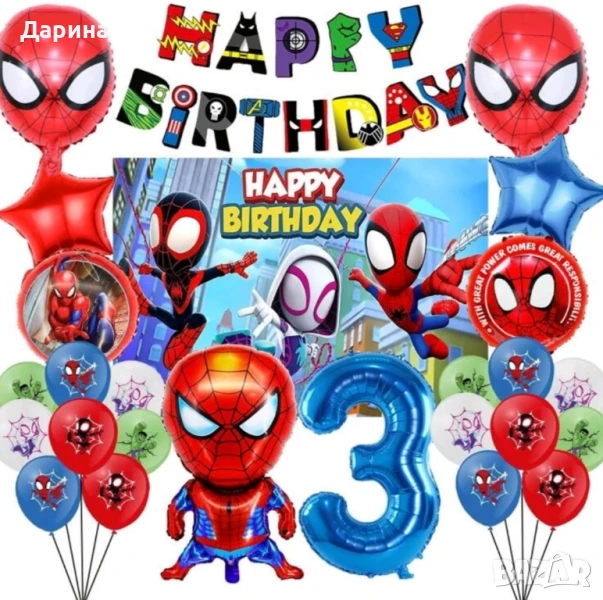 Латексови балони Спайдърмен или Спайди - 30см. К-ти по 12бр. - 16лв./8.18€. Банер ,,Happy Birthday" Спайдърмен/Спайди - 15лв./7.67€. Покривка Спайдърмен 108/180см - 9лв./4.60€. Покривка Спайди 108/180см. - 9лв. /4.60€. Нови.