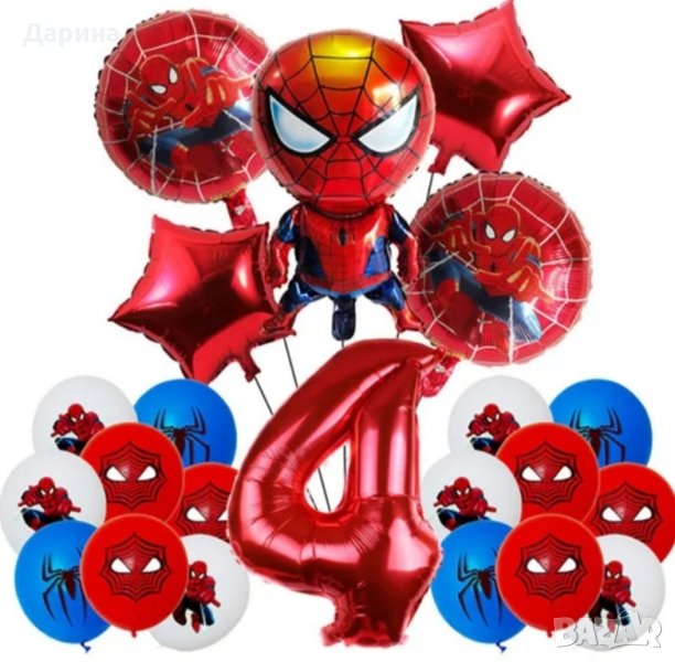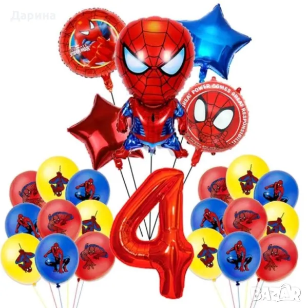 Парти сет от 24 балони за тематично парти Спайдърмен. Сета се състои от: 1бр. фолиев балон на Спайдърмен 45/68см, 2бр. звезди 45см, 2бр. кръгли балони 42см, 1бр.цифра 80см (от 3 до 8г.) и 18бр. латексови балони - 35лв. Парти сет Спайди от 26бр. части - 1бр. винил 100/75см., 1бр. банер 17/18см., 7бр. фолиеви балони, 16бр. латексови балони и 1бр. цифра 80см. от 2 до 9г. - 65лв./33.23€. Парти сет Спайди -10бр. фолиеви балони - 30лв./15.34€.