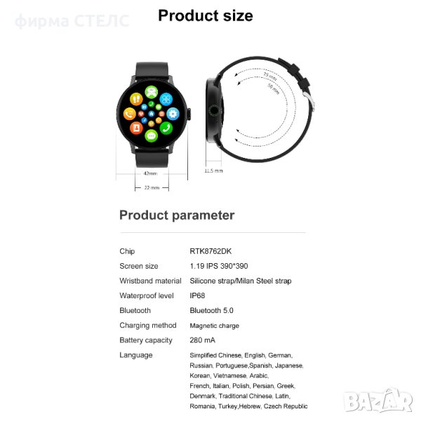 STELS DT22 Smartwatch 1.19 инчов HD 3D стъкло Чип : RTK8762D, 64Kb RAM, 64 Mb ROM, 280mAh полимерна батерия