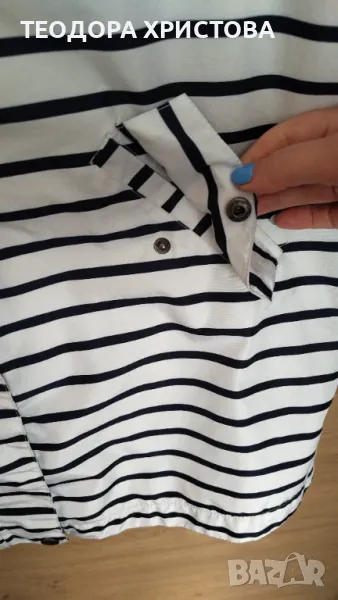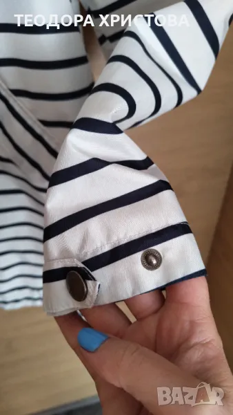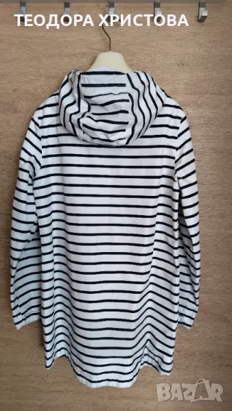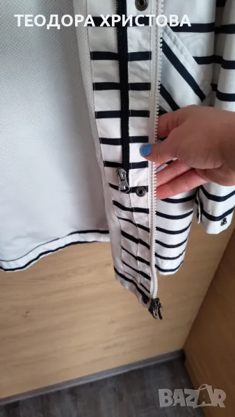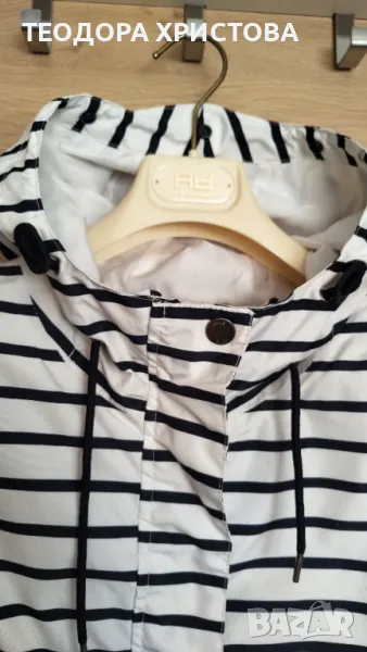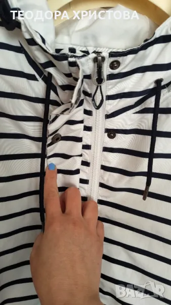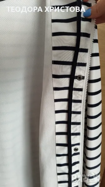 Шлифер/Тренч, непромокаем, размер M, морски десен: тъмносиньо и бяло райе, немахаща се качулка, два джоба с капаци и клипс, двойно закопчаване по цялата дължина, с "дишаща" подплата. Отлично състояние. ГО 104см, дължина 80см, ръкав 63см.