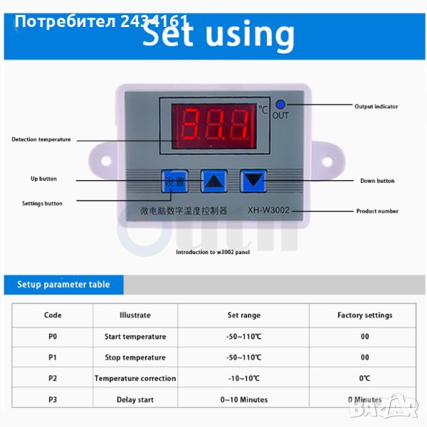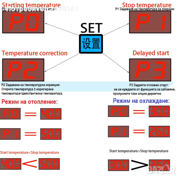 Натиснете бутона за настройка веднъж, за да влезете във вътрешното меню, цифровият дисплей е P0, превключете на P1, като натиснете бутоните нагоре и надолу, натиснете бутона за настройка отново и задайте желаната температура за спиране, като натиснете бутоните нагоре и надолу.