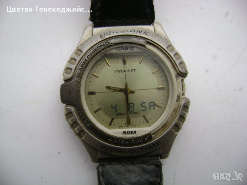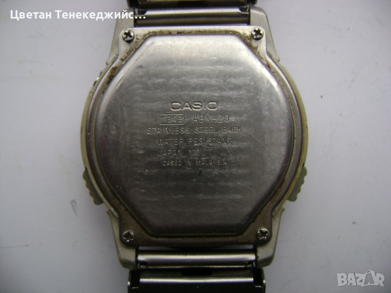 Casio ABX-20. Работи точно .Цифров и аналогов.Цифровият е на стъклото.Теле мемо,световно време,аларма,хронометър,водоустойчив.Кожена каишка.-110лв.