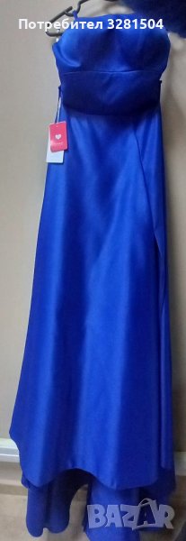Нова, с етикет. Талия 74-78см. Дължина отпред 115см,дължина отзад 140см. С лява цепка отпред. Материал сатен. С вградени подплънки и подплата. Цвят кралско синьо. Производител Jj's house.