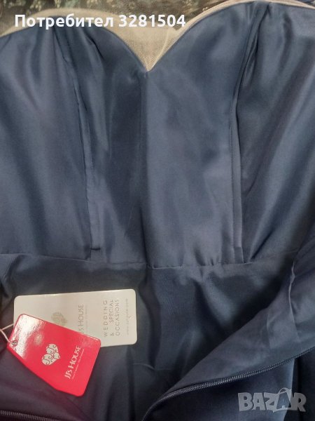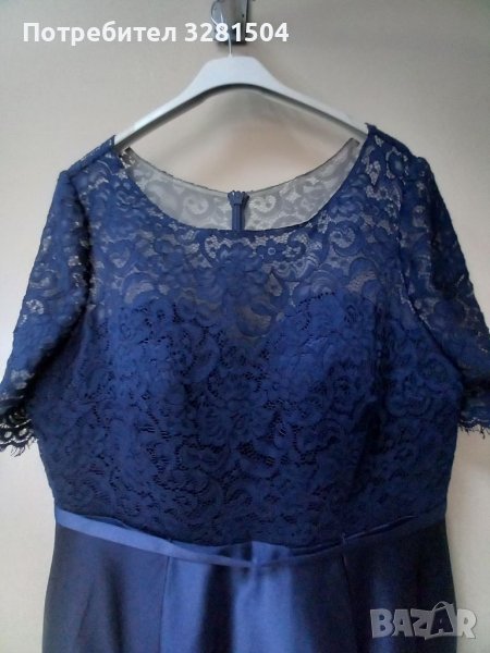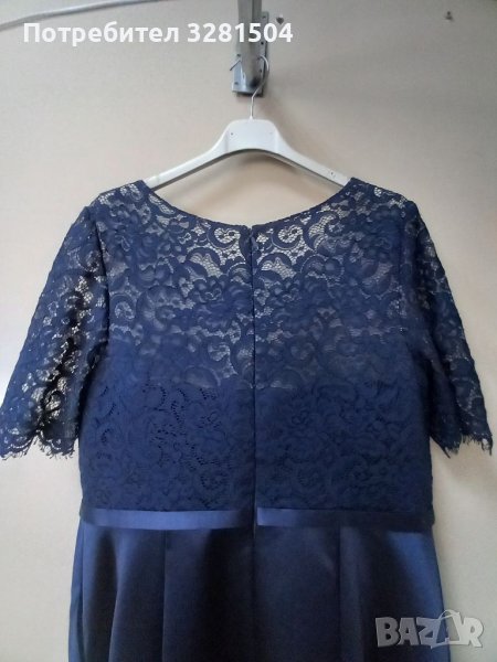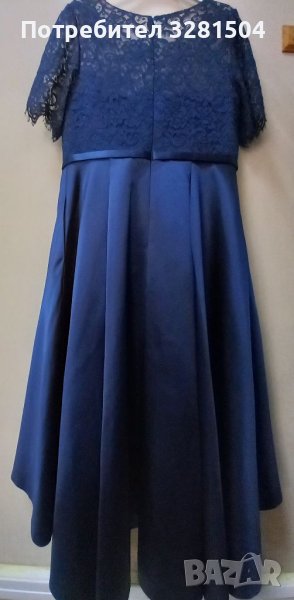 Талия 90см, бюст 110. Нова, с етикет. Цвят тъмно син. Материал дантела и сатен. А силует. Асиметрична. Дължина отпред 105см,дължина отзад 140см. С две вертикални банели.